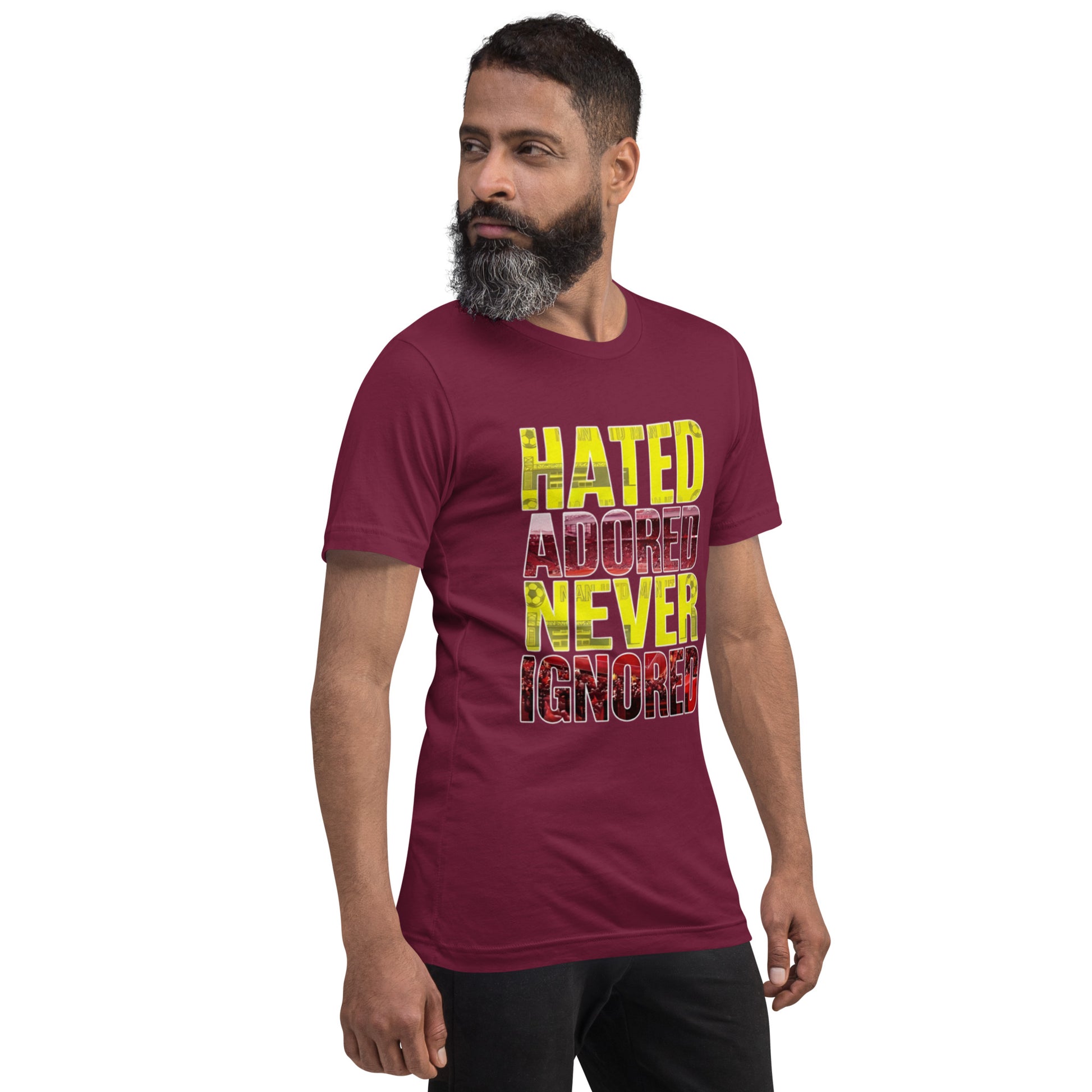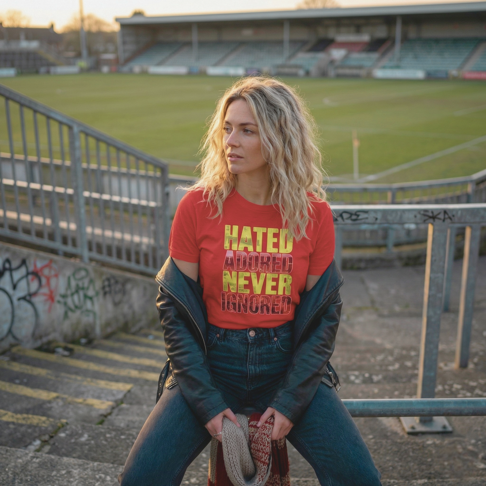 The Design Featuring the iconic mantra "HATED ADORED NEVER IGNORED" stacked in a bold, uncompromising typography, this graphic demands attention. The "Adored" and "Ignored" are struck in a deep, blood-red hue—symbolizing the heart of the club and the fire of the fanbase—while a razor-sharp white outline cuts through the noise for maximum visibility.